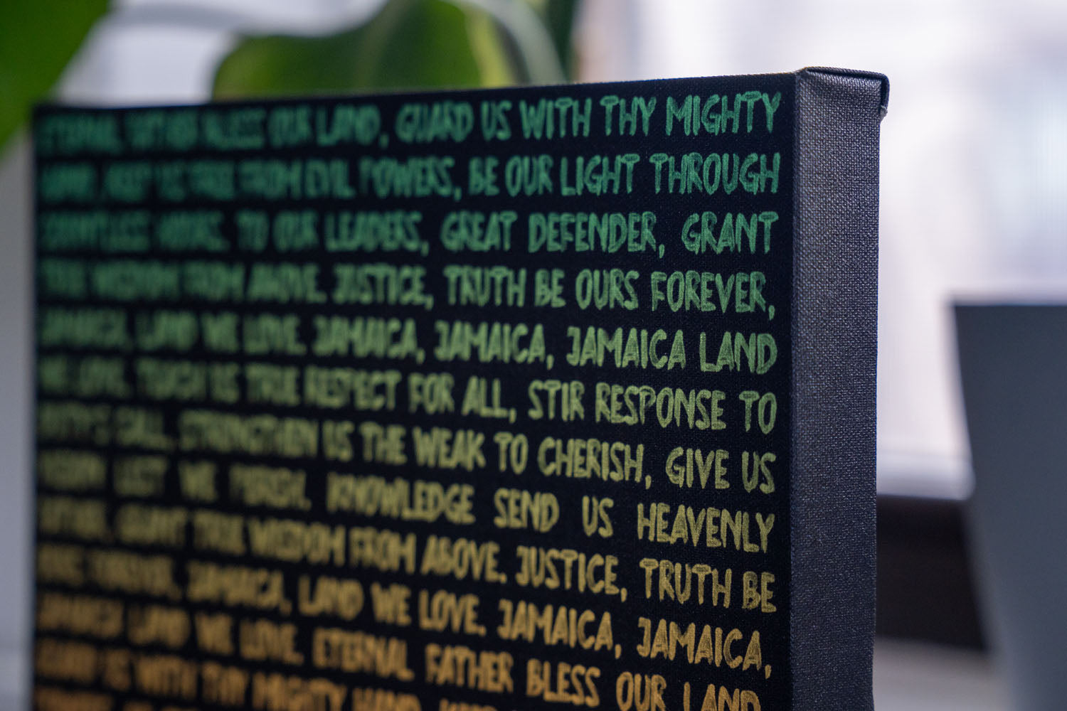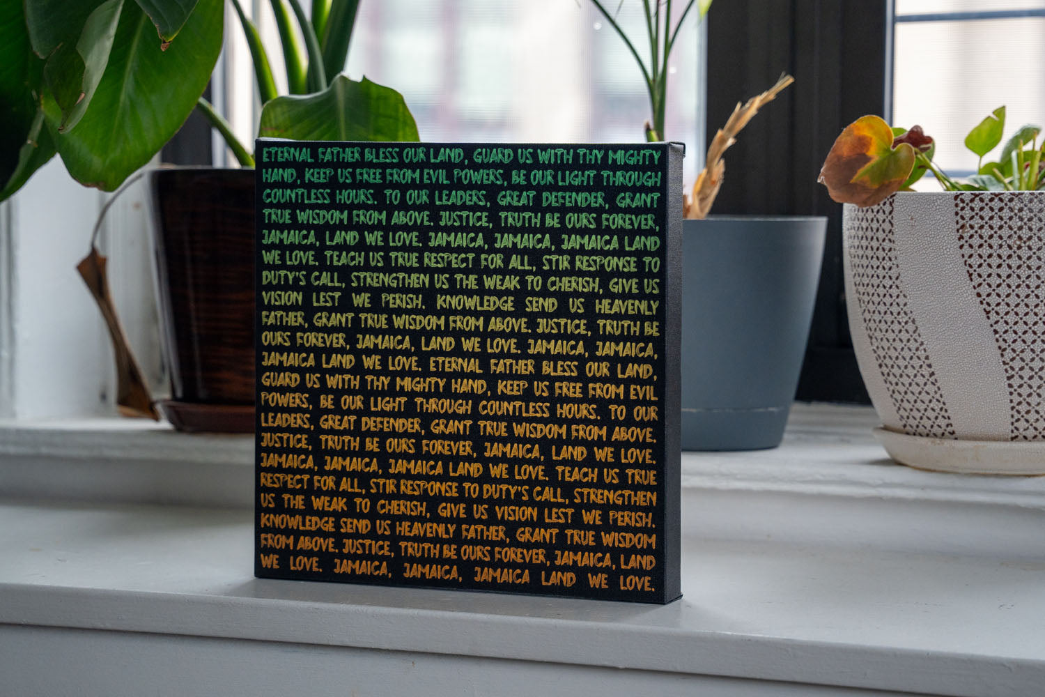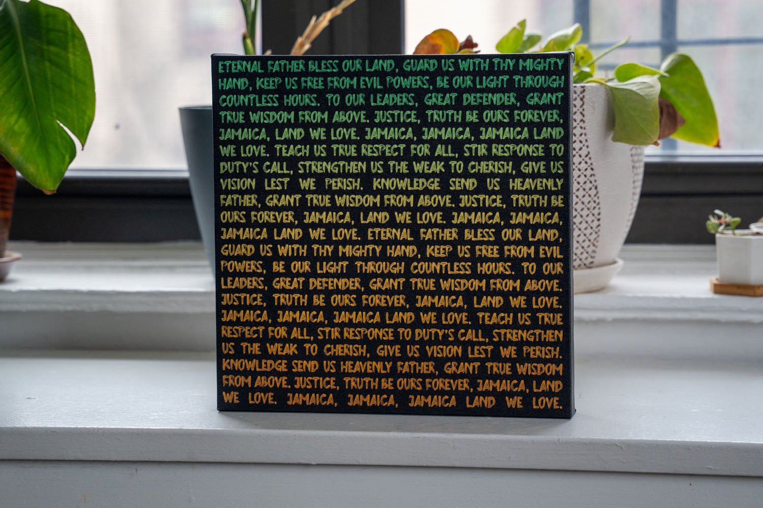 Celebrate the power and pride of Jamaica with this vibrant typography artwork featuring the full Jamaica National Anthem. Designed in a bold green-to-gold gradient inspired by the island’s iconic colors, this piece brings cultural reverence and lyrical beauty into any room. Perfect for Jamaicans at home or abroad, it adds meaning, history, and motivation to your walls.