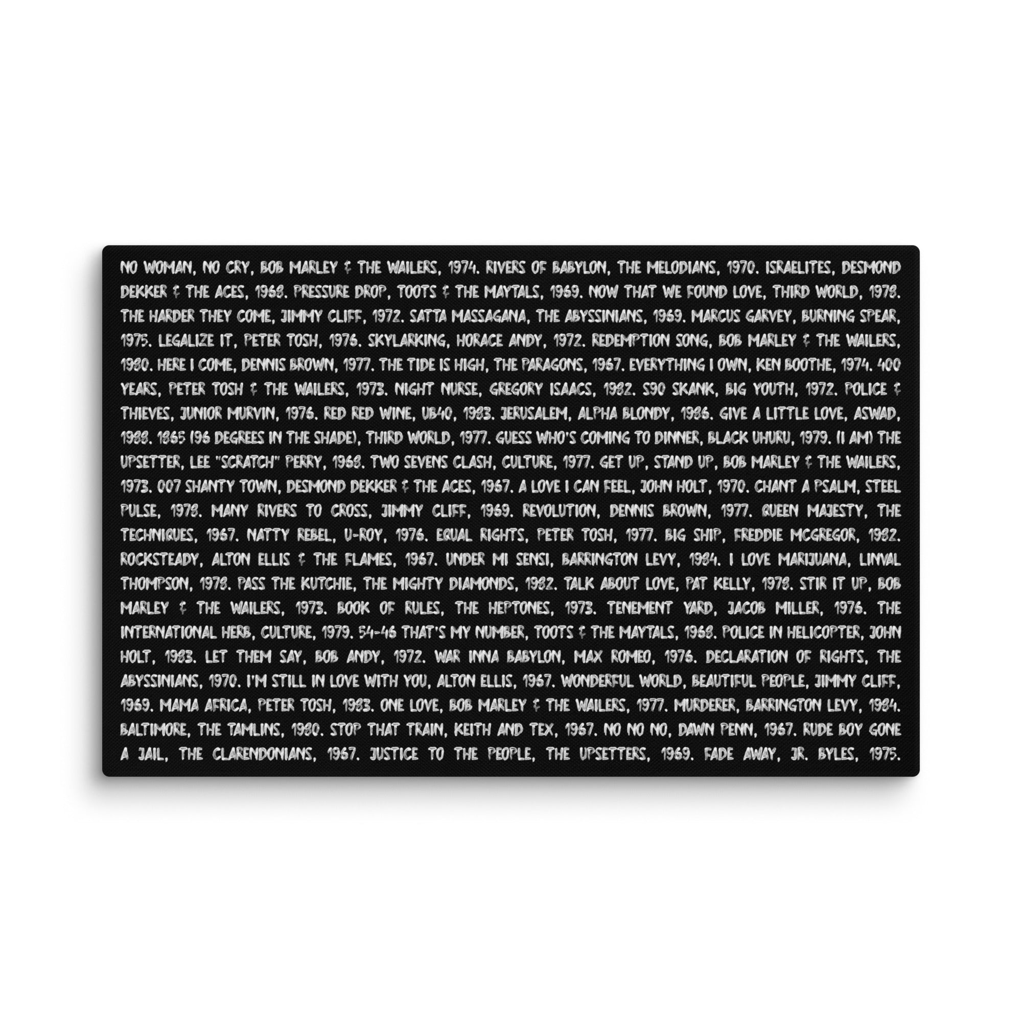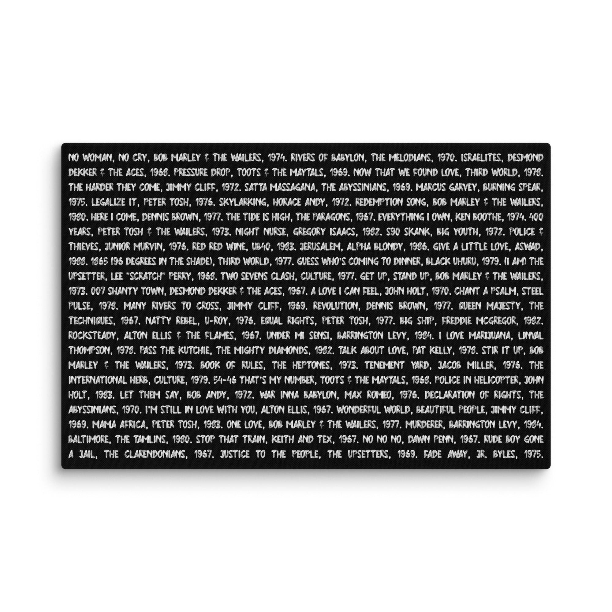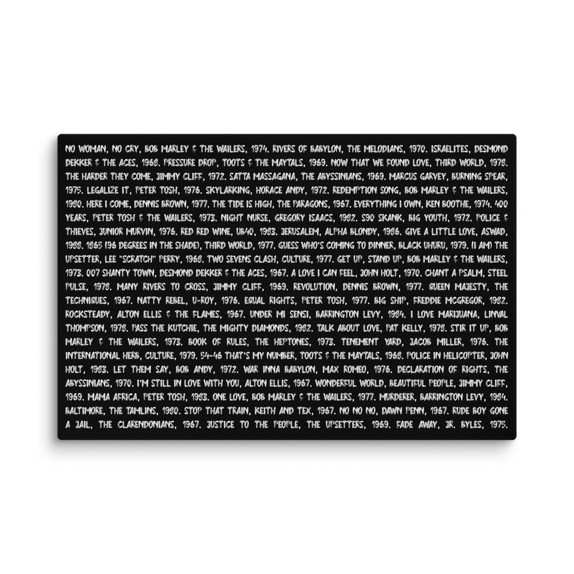 This canvas celebrates the soul of reggae — the voices, songs, and visionaries who carried the rhythm of Jamaica to the world. Printed in white text on a rich black background, it immortalizes the timeless classics that shaped generations.